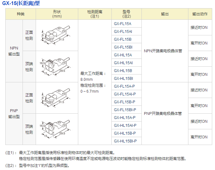 GX-15型實現(xiàn)了最大動作距離8.0mm±8%的長距離型的添加。